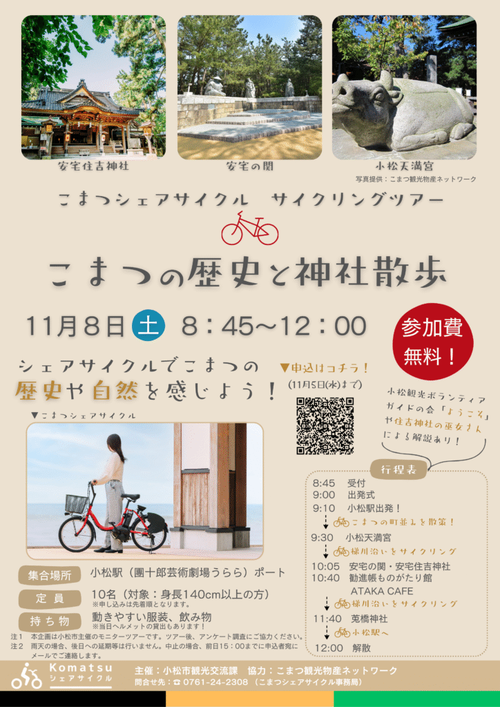 こまつシェアサイクルで巡るサイクリングツアー「こまつの歴史と神社散歩」を開催いたします!