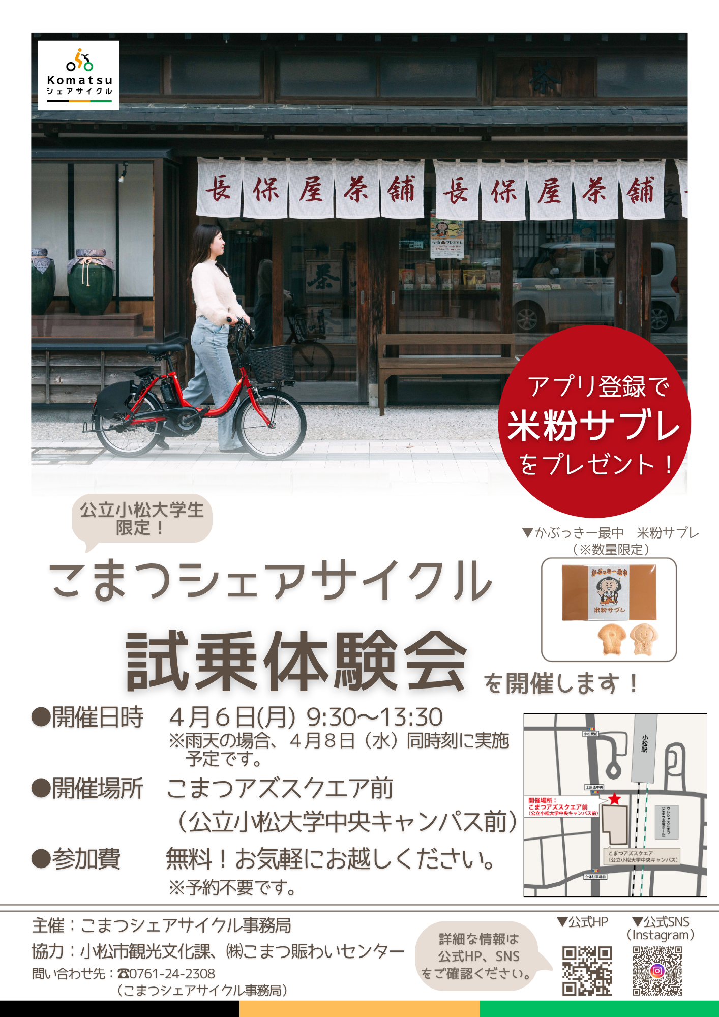 4月6日(月)に、こまつシェアサイクルの試乗体験会を開催いたします!